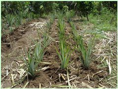 Les professionnels gèrent la croissance en fertilisant les champs et en provoquant la floraison (donc la fructification) à l'aide de produits spécifiques.Alignements d'ananas sur le marché et dégustation