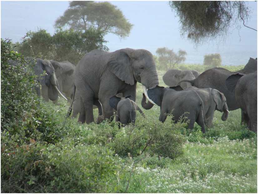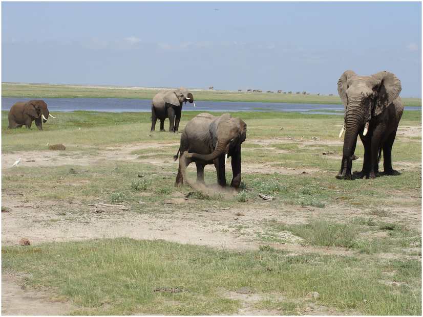 dans le parc d'Amboseli une bande de babouin cèdent la place à un troupeau d'éléphant qui arpentent la savane en s'empoussiérant,