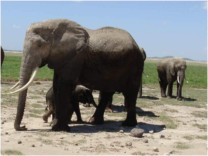 Pour se protéger du soleil les éléphants se projettent de la poussière sur la peau, la latérite rouge leur donne une couleur marron. La densité de la savane dans le parc de Tsavo Ouest rend l'observation des animaux difficile,