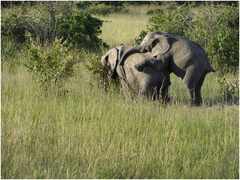 deux éléphanteaux s'amusent à se charger dans l'herbe haute du Massaï Mara.