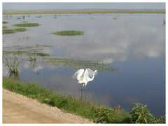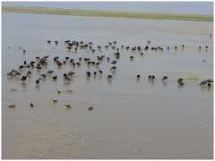 Les aigrettes, sur l'îlot au centre deux petites aigrettes, deux échasses blanches en premier plan et deux oies d'Egypte,