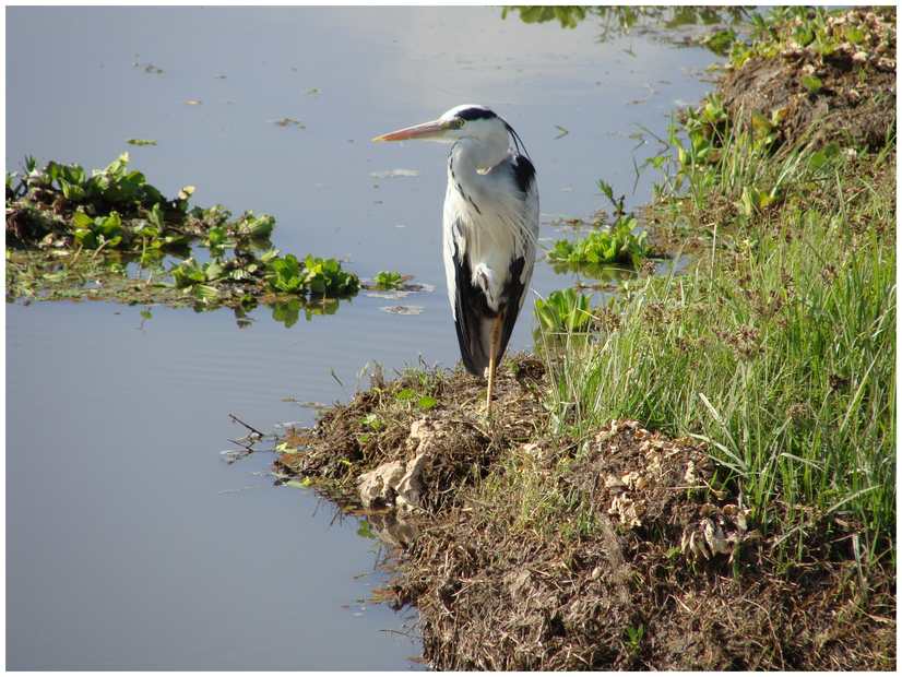 un cormoran et une oie d'Egypte; un héron crabier au bord de l'étang,