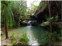 Notre parcours nous mène à une petite oasis de verdure où s'écoule une petite cascade dans une piscine naturelle. Nous descendons nous rafraîchir en suivant le sentier bordé de grands vacoas, de fougères arbustives et de Bambous.