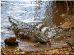 Attiré par les claquements de mains et les chants un crocodile sort de l'eau.