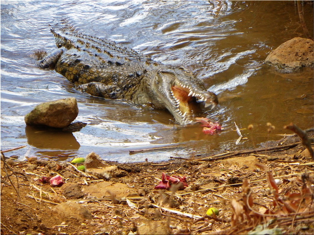 Attiré par le bruit et les morceaux de viande lancés au bord du lac par notre guide un gros saurien fini par montrer ses modestes quenottes (là, je plaisante). La bestiole étant rassasié et le reste de la viande offerte aux participants, il est temps de penser à nos estomacs.