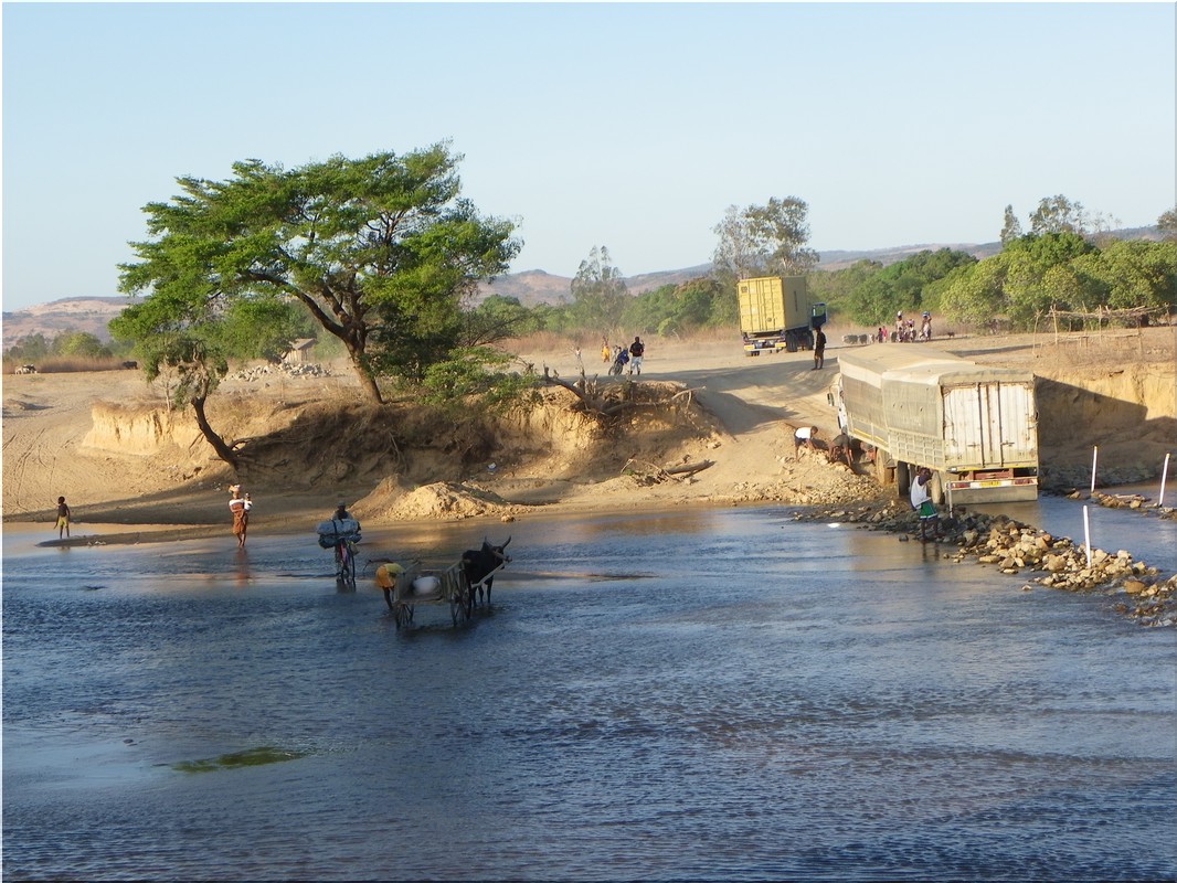 A Ambilobe nous retraversons le gué. C'est la fin de l'après-midi et les villageois font leur toilette et la lessive dans la rivière. Les jeunes s'éclatent et font des pirouettes dans l'eau.