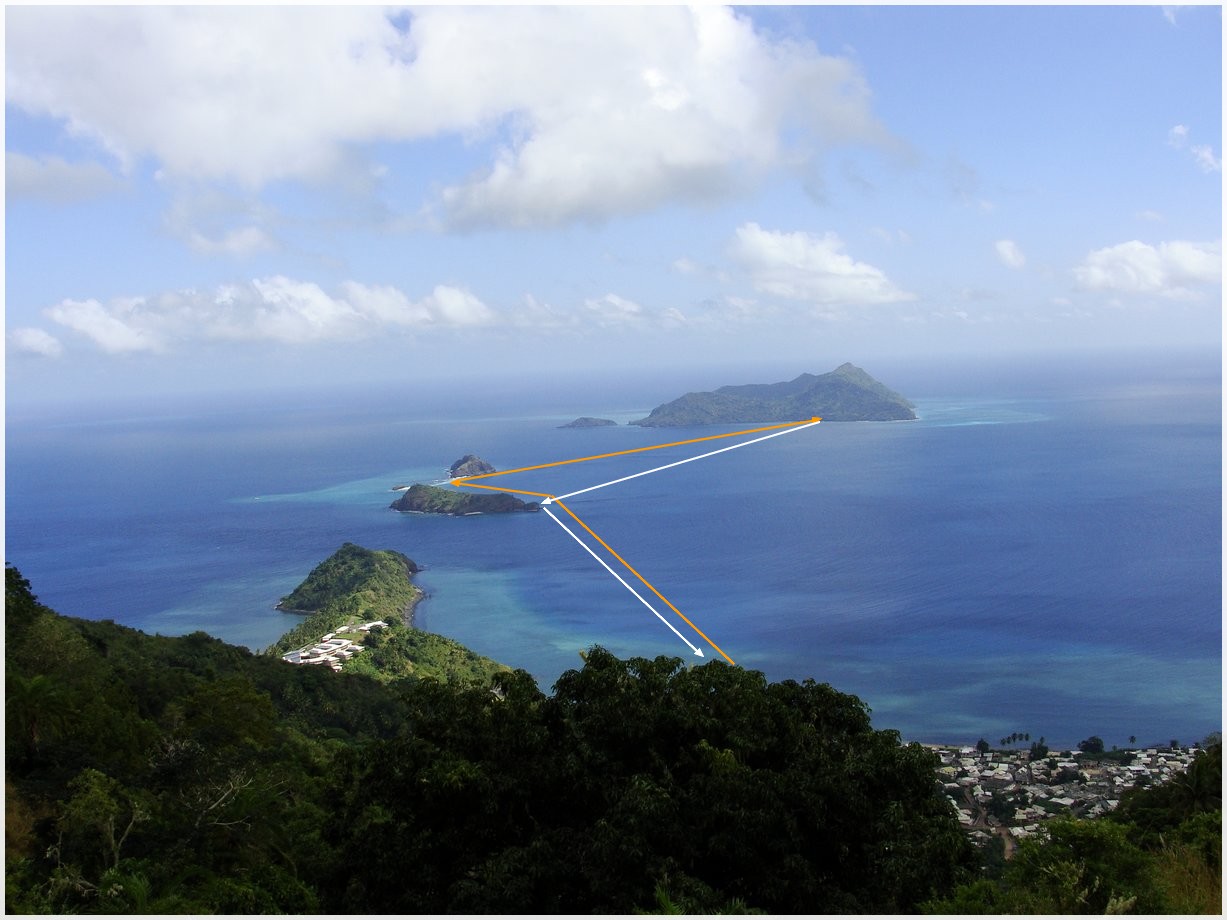 Depuis une plage de l'îlot Mtsamboro, en face sur la côte nord de Mayotte, on aperçoit au loin le village de Mtsahara (notre point de départ) et à sa gauche, au pied du cap "Rassi Douamounyo", la plage du préfet.