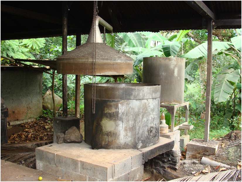 Le sentier traverse quelques gués, monte le long des jardins et des exploitations d'ylang ylang, puis s'enfonce dans la forêt. Dans le nord de l'île de Mayotte il y a de nombreux orangers plus ou moins bien entretenus. Dans la pénombre et la fraîcheur d'un bosquet un jardinier cultive de la vanille.