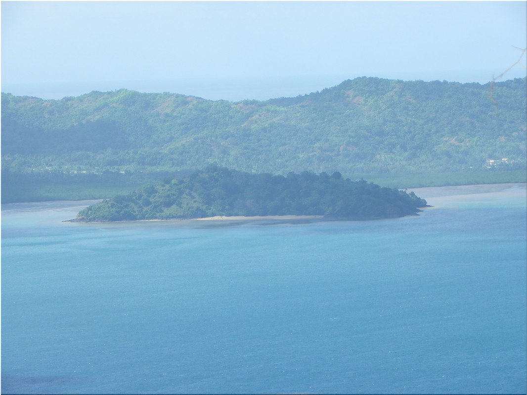 Comme le colibri, un petit souimanga se nourrit de nectar. Dans la baie nous apercevons l'îlot Karoni.