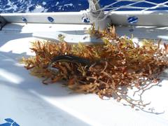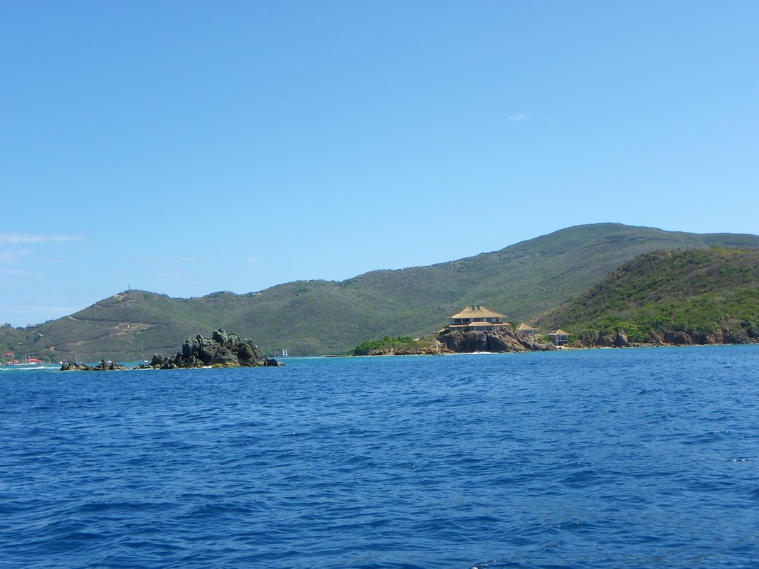 Une traîne est mise à l'eau , au cas où un poisson passerait par là. Une heure plus tard, la mer est encombrée d'algues brunes, les sargasses, qui s'accrochent à la traîne. Il y a donc peu de chance de pêcher une dorade ou une bonite pour le dîner. Nous faisons de petites siestes à tour de rôle et nous bouquinons pour passer le temps. A 11h la terre est en vue et vers 14h nous contournons Necker Island par le nord pour rentrer dans la grande baie de Gorda Sound. Ici, tout est "Sound" : Gorda Sound, Virgin Sound, North Sound. Pour nous reposer nous mouillons face à la petite île de Prikly Pears.