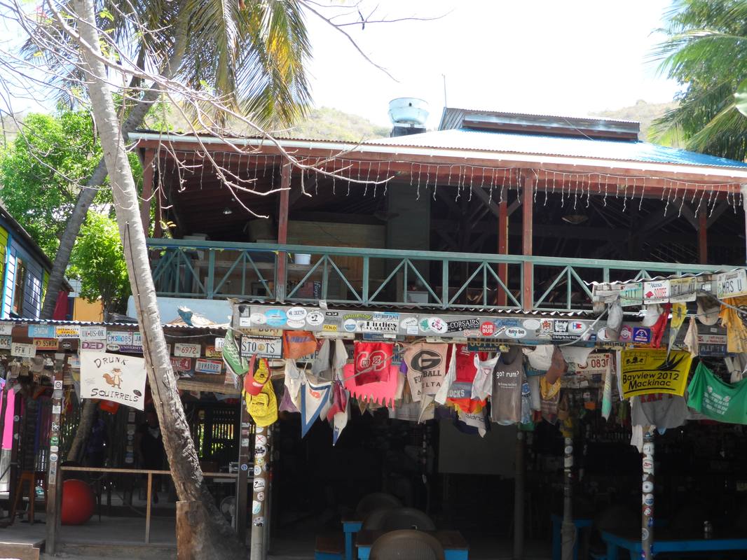 A terre il n'y a pas de village proprement dit, mais, le long de la plage un alignement de boutiques, de restaurants bars et une épicerie. La décoration des bicoques semble tirée de film de pirates, comme le nom de l'île. Nous prenons un verre chez Foxy's sous les innombrables fanions, t-shirts et plaques d'immatriculations accrochés aux murs et au plafond. On sens que l'ambiance en soiré doit être chaude !.