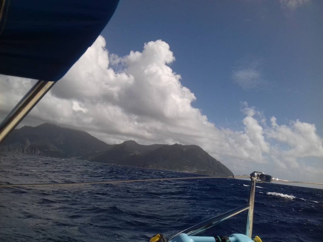 Vendredi 16 novembre, nous partons à l'aube pour rallier Saint Pierre au nord de la Martinique. Nous longeons la côte sous le vent de la Dominique. Après avoir essuyé quelques venturis générés par les montagnes et les ravines dans la zone de Roseau nous réduisons les voiles pour attaquer le canal de la Dominique / Martinique.