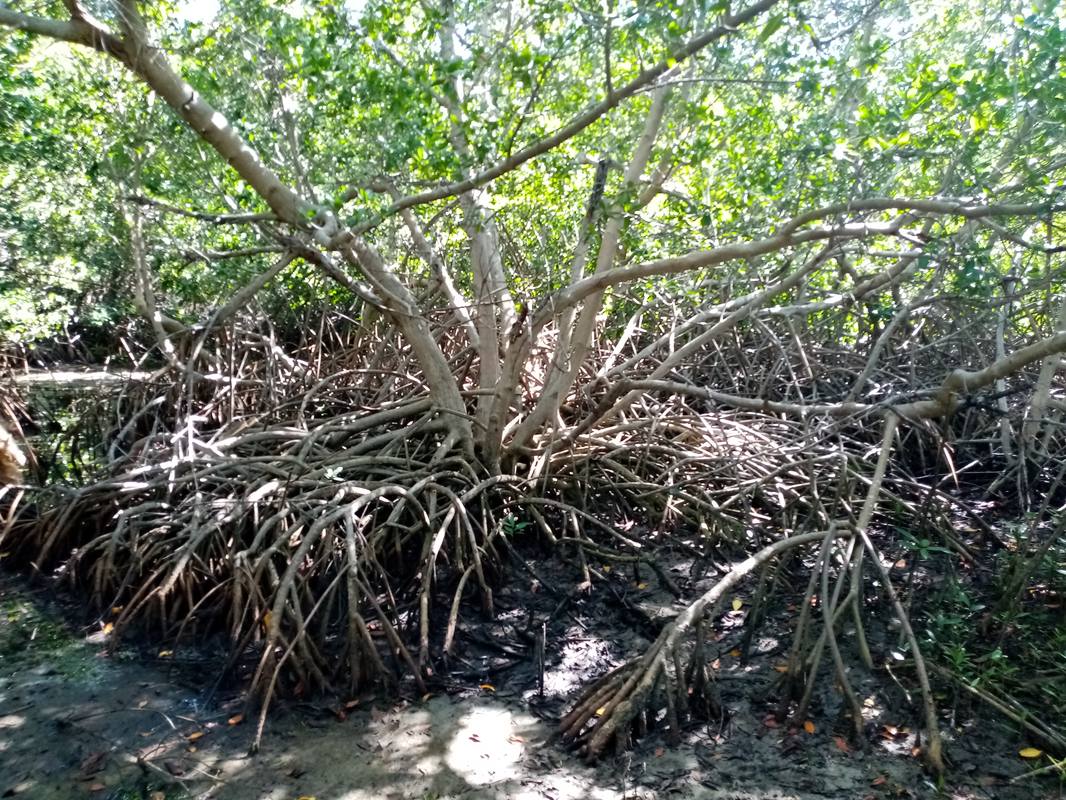 Un étal du marché de Sainte Anne. Les sansevières en fleurs. Les racines échasses des paletuviers. Un petit gué.